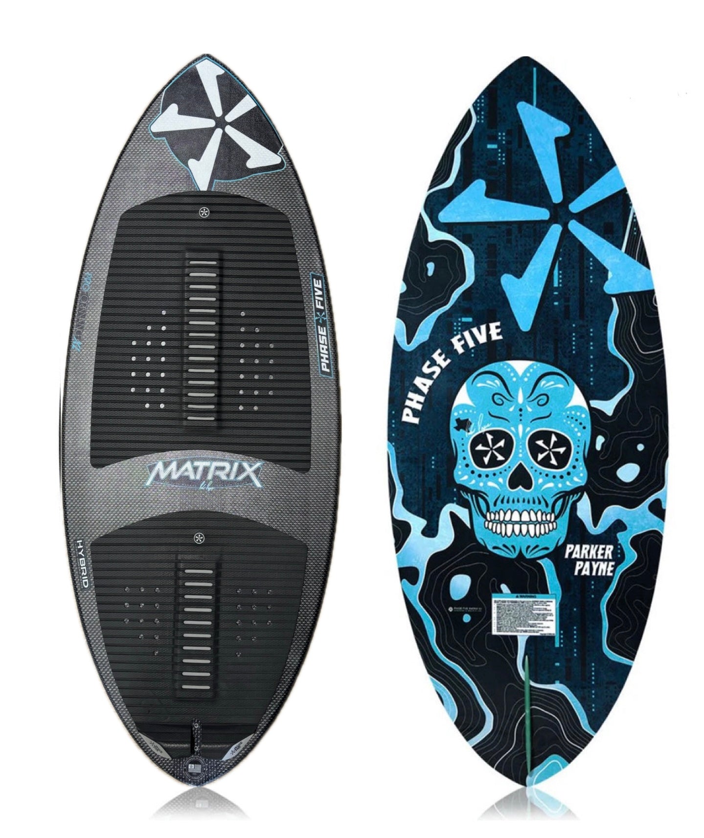 The Phase Five Matrix Wakesurfer is an advanced board delivering unrivaled performance. Adopted by many professional riders on the team, the Matrix is sealed and approved to meet the highest expectations. The Matrix is made with a thinner core and boxy rails for ultimate POP and responsiveness. The symmetrical outline rides incredibly well backwards while the subtle V-Spline bottom contours generate trick demanding speed and sensitivity. It includes an added carbon stringer for next level pop, and is constructed with Hybrid Carbon™ material to take a beating.. The Matrix is built with a single fin setup and loaded with our 1” Skim Fin. The Matrix Payne Pro features a unique bottom graphic that Parker Payne dreamed up. No specific design or construction features differentiate the Payne Pro from the Matrix.